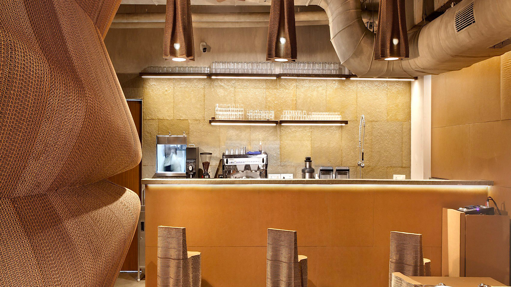 環境に優しい素材を使うことにしたのはリサイクルしやすいということだけではなく何層にも重ねることで目的の形状をつくり出せることや店舗での音を吸収できることなど段ボールの多様性があったからだそうです。素材の扱いやすさから壁・椅子・テーブル・さらにはランプシェードまで段ボールでつくられています。木の年輪のような風合いもありますね。